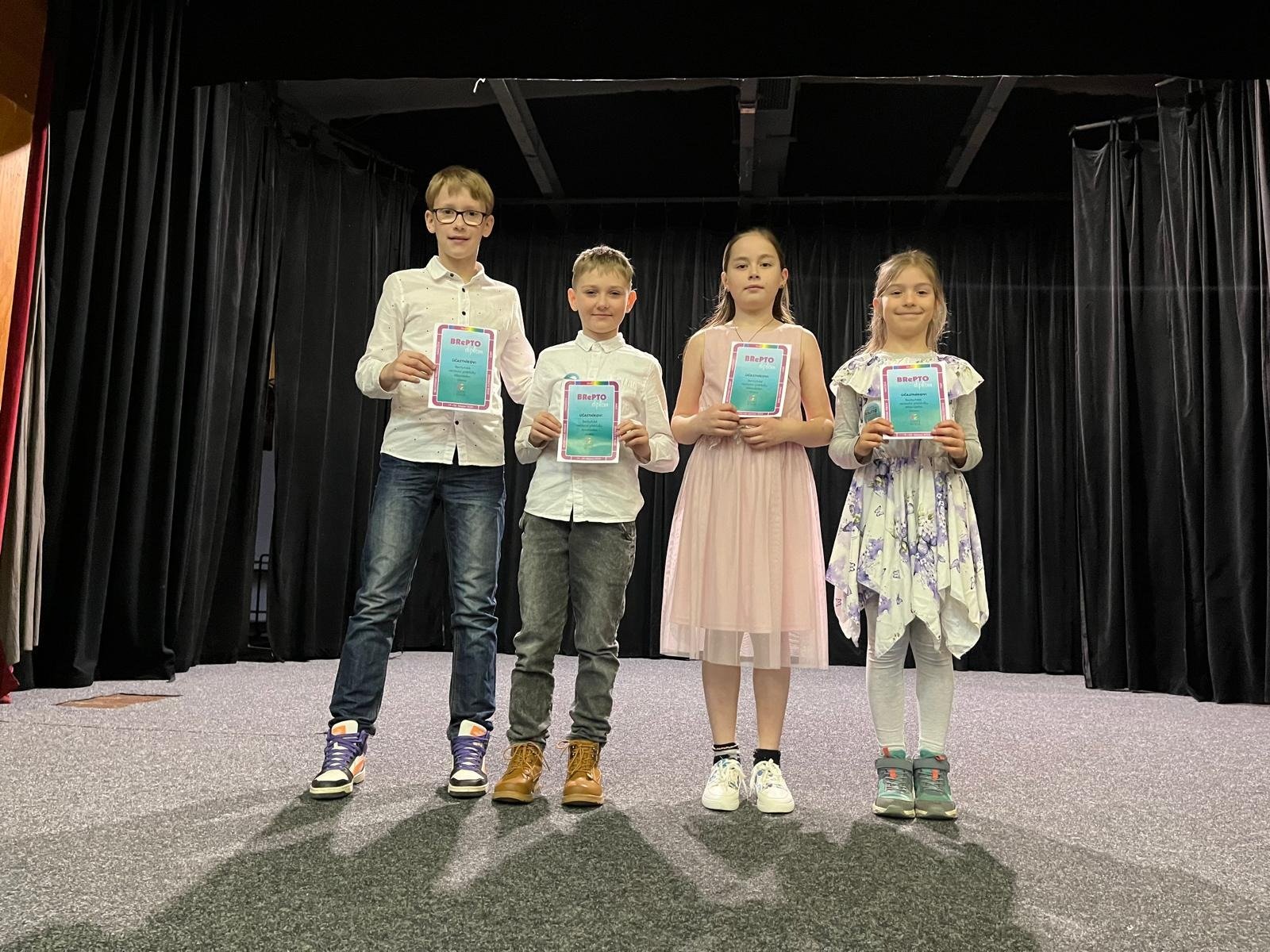 Ve čtvrtek 19. března se vydala čtveřice statečných zástupců naší školy poměřit své recitátorské dovednosti. Okresní kolo soutěže BrePto se od minulého roku koná v krásném prostředí kulturního domu v Bechyni, kde jsme měli možnost vystoupat na pódium malého divadelního sálu. Všichni naši recitátoři předvedli kvalitní výkon, za který jim tímto děkujeme!