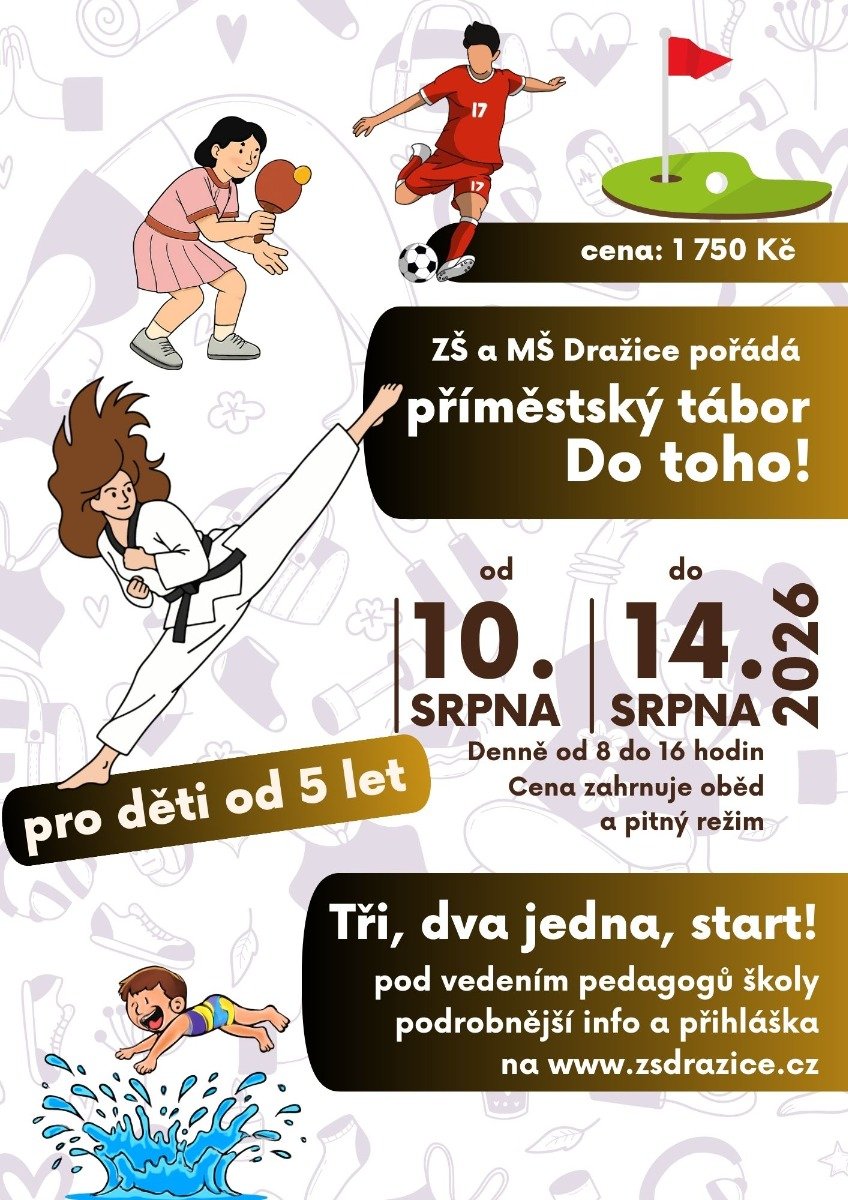v průběhu letních prázdnin se již tradičně uskuteční příměstský tábor pořádaný naší základní školou, a to v termínu 10. - 14. srpna 2026 (pondělí až pátek). Cena tábora je 1 750,- Kč, částku prosíme uhradit do 19. června 2026 na účet školy 2401612808/2010 (popis pro příjemce – jméno dítěte). Čeká nás hodně sportovních her a delších výšlapů, zvažte proto fyzické možnosti dětí. Minimální věk účastníků je 5 let.
